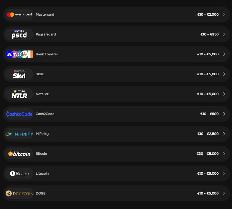 | Dogecoin | €10 | €10 | Under 1 hour |